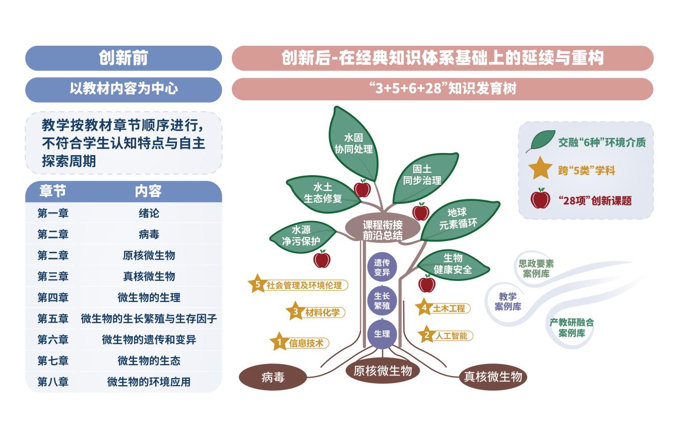 《环境微生物学》是一门面向大二学生的专业必修课,如何帮助学生从入门向专业进阶,这节课发挥着重要的作用。怎样才能把这门课上好呢?教学团队进行了深度思考,“要突破传统的课堂教学方式引起同学们的学习兴趣,也要让他们真正地掌握环境微生物学的知识。”传统的教学内容相对局限于常规污染物的微生物转化原理,课程通常也只是按照不同的环境介质进行分类,缺少对多介质交融环境问题的探讨,而微生物作用其实是贯穿于多介质间的。因此,学生需要具备跨学科的知识体系和思维能力,并且熟悉生物在多介质交融下的作用特点。针对这一现状,教学团队创新提出“跨学科交叉+多介质交融+进阶式交互”的教学新模式,重构各教学章节,形成了“3+4+6+28”知识发育树,即“3阶”根-干-叶的知识发育树,跨“5类”学科,交融“6种”环境介质组合类型,交互“28项”创新课题。