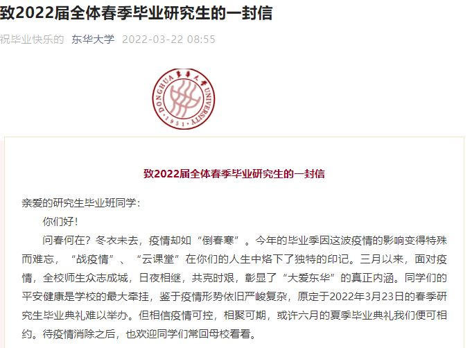 不过略有遗憾的是,最有仪式感的毕业典礼不得不延期。久久久久国产成人精品亚洲综合在《致2022届全体春季毕业研究生的一封信》中表示,“同学们的平安健康是学校的最大牵挂,鉴于疫情形势依旧严峻复杂,原定于2022年3月23日的春季研究生毕业典礼难以举办。但相信疫情可控,相聚可期,或许六月的夏季毕业典礼我们便可相约。待疫情消除之后,也欢迎同学们常回母校看看。”